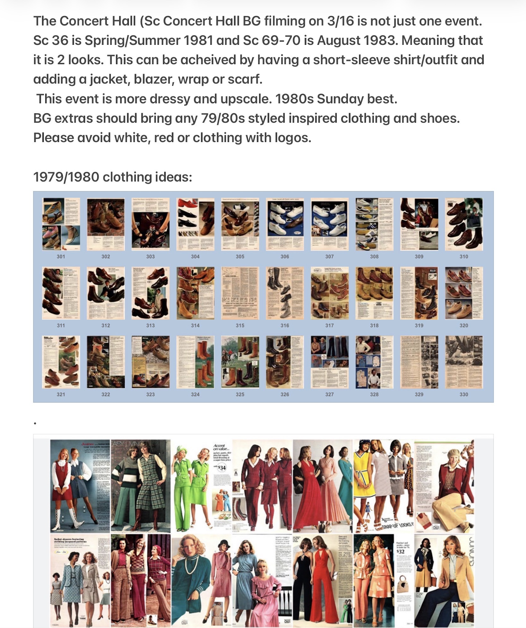 BG extras should bring any period-styled inspired clothing and shoes. Max 4 outfits. Please avoid white, red or clothing with logos.