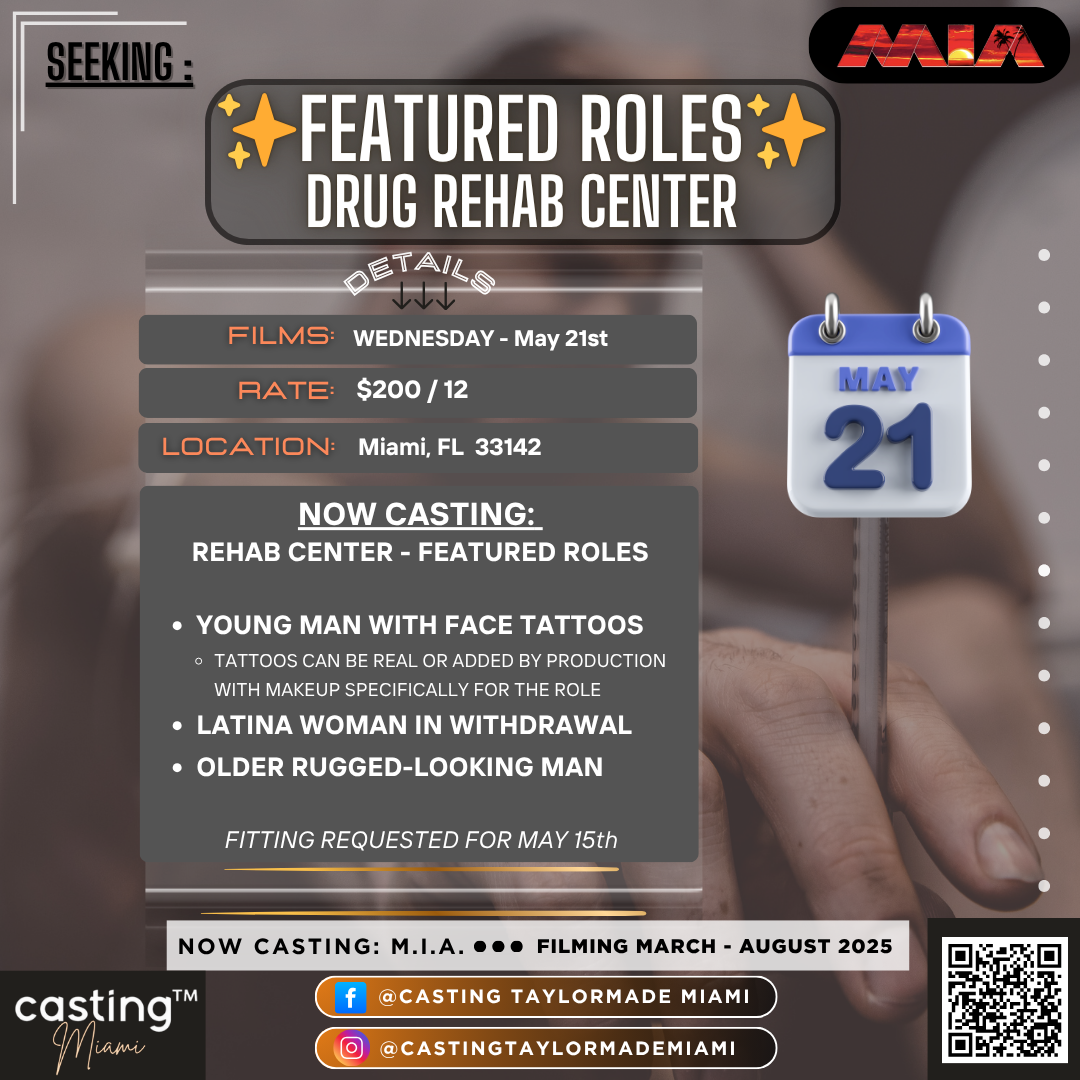 Casting™ is currently booking FEATURED ROLES at a DRUG REHAB FACILITY on “M.I.A." to film in MIAMI, FL on WEDNESDAY, May 21st.