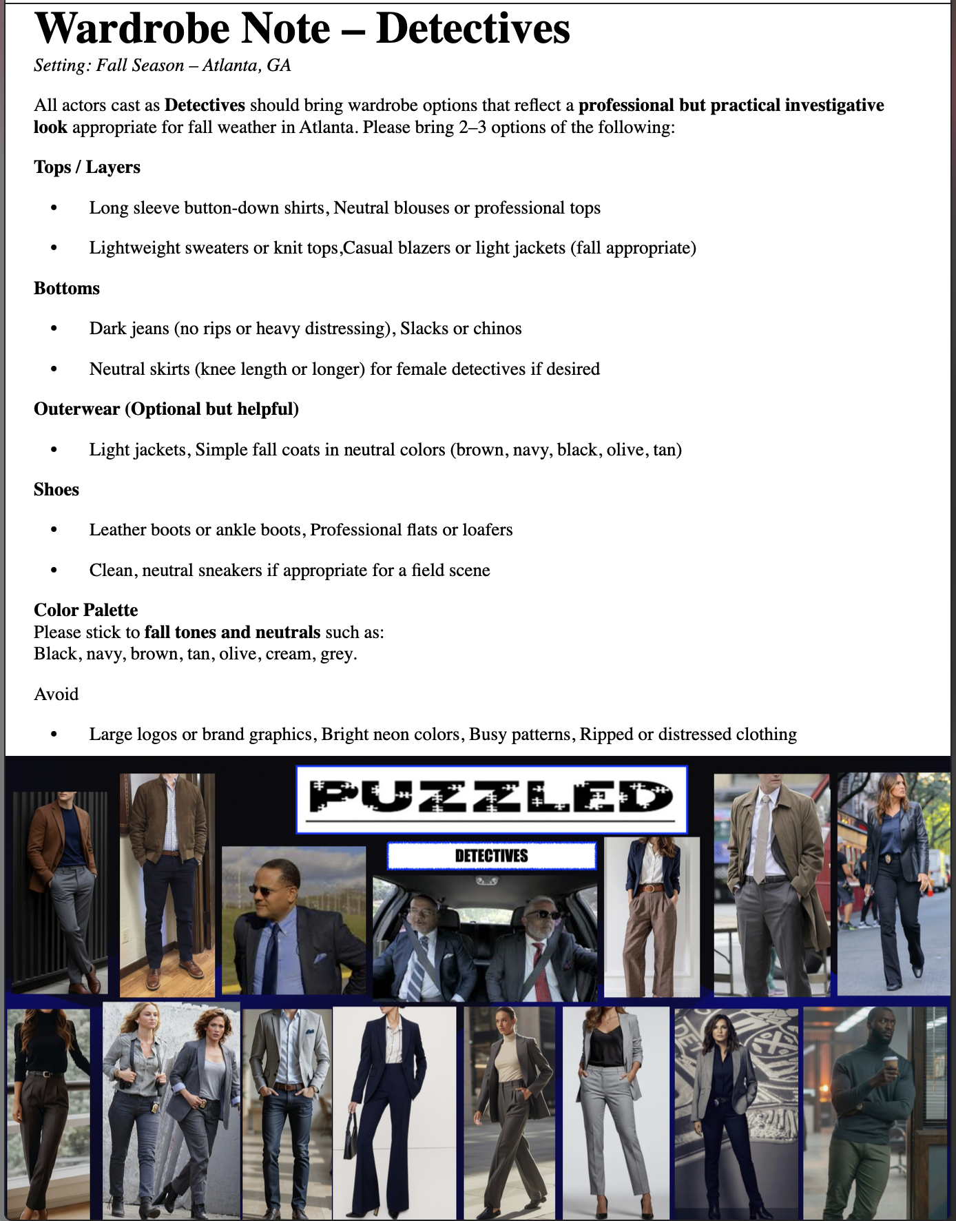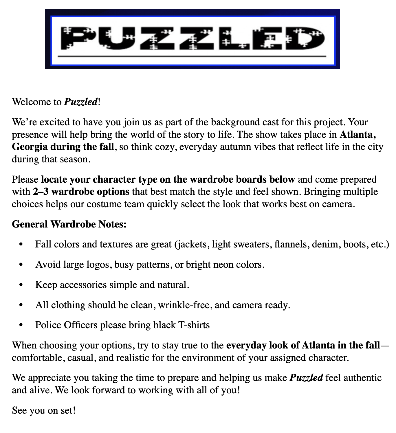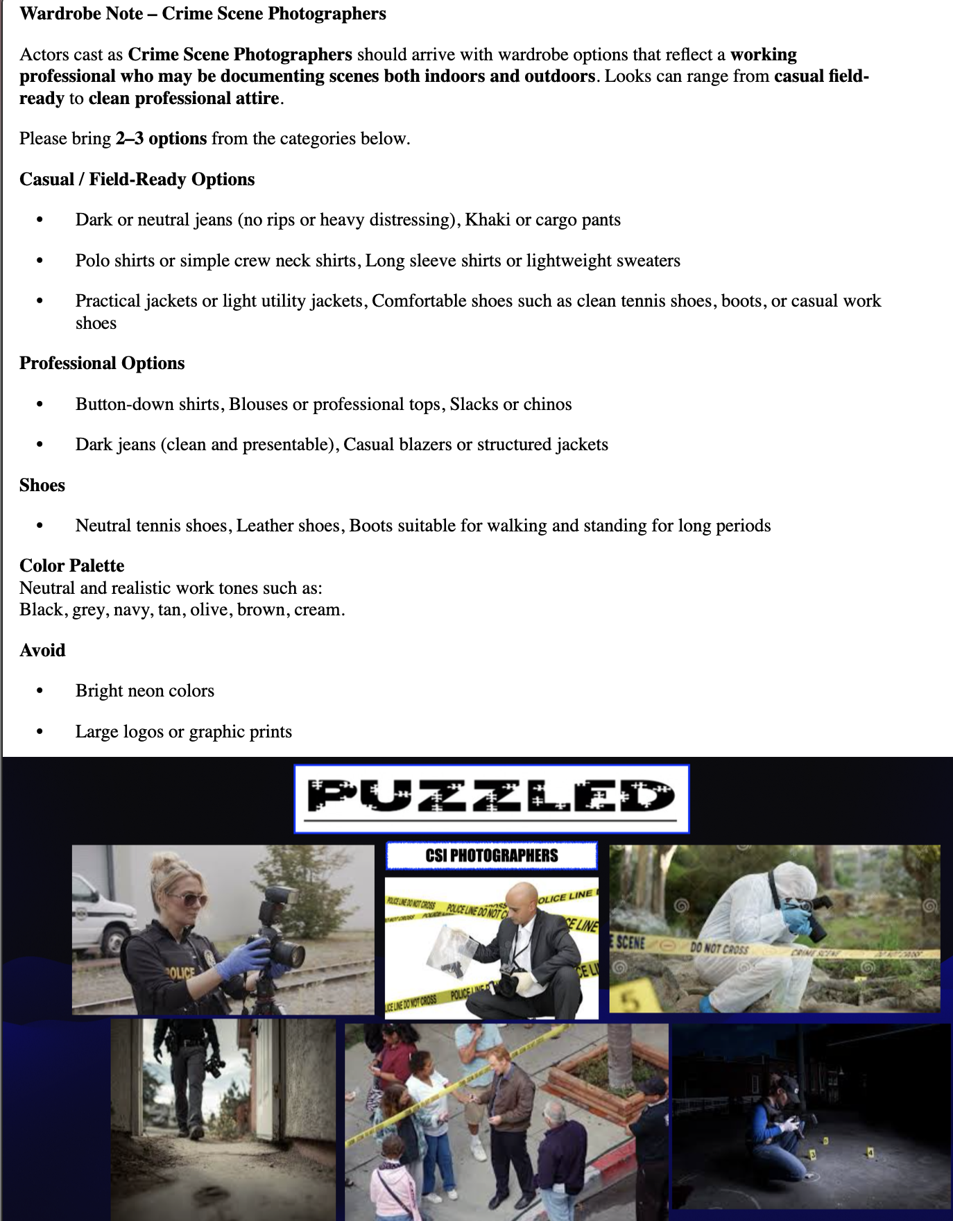 PLEASE BRING AT LEAST 3 FULL OUTFIT OPTIONS FOR THE ROLE YOU HAVE BEEN BOOKED FOR. IT IS VERY IMPORTANT YOU BRING OUTFIT OPTIONS PLEASE!!!