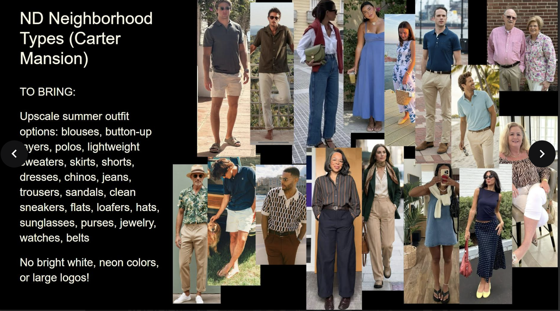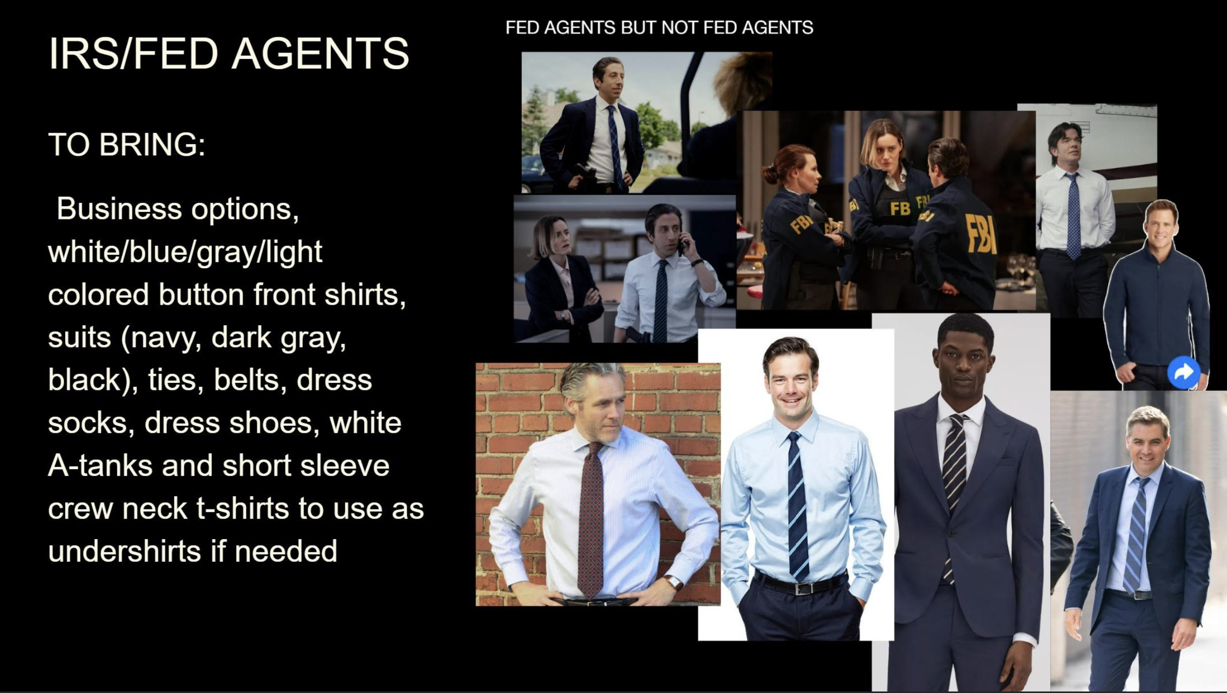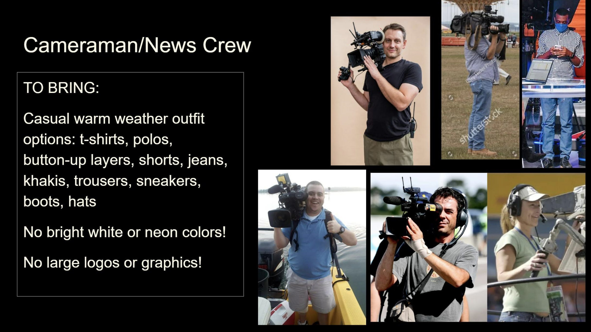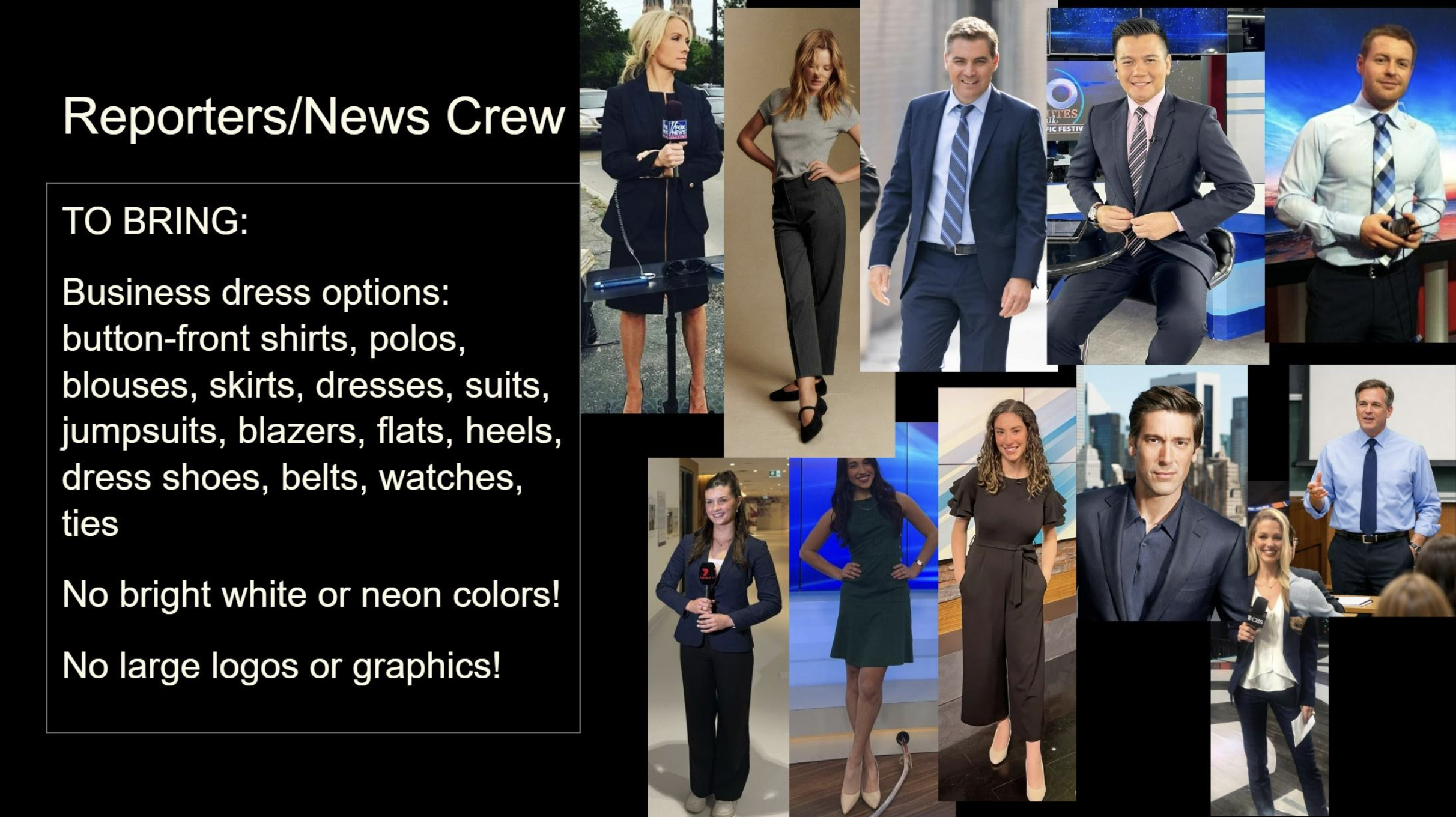 ⚠️ Please remember: the costume department will not have backup wardrobe for you. We are depending on you to bring options.