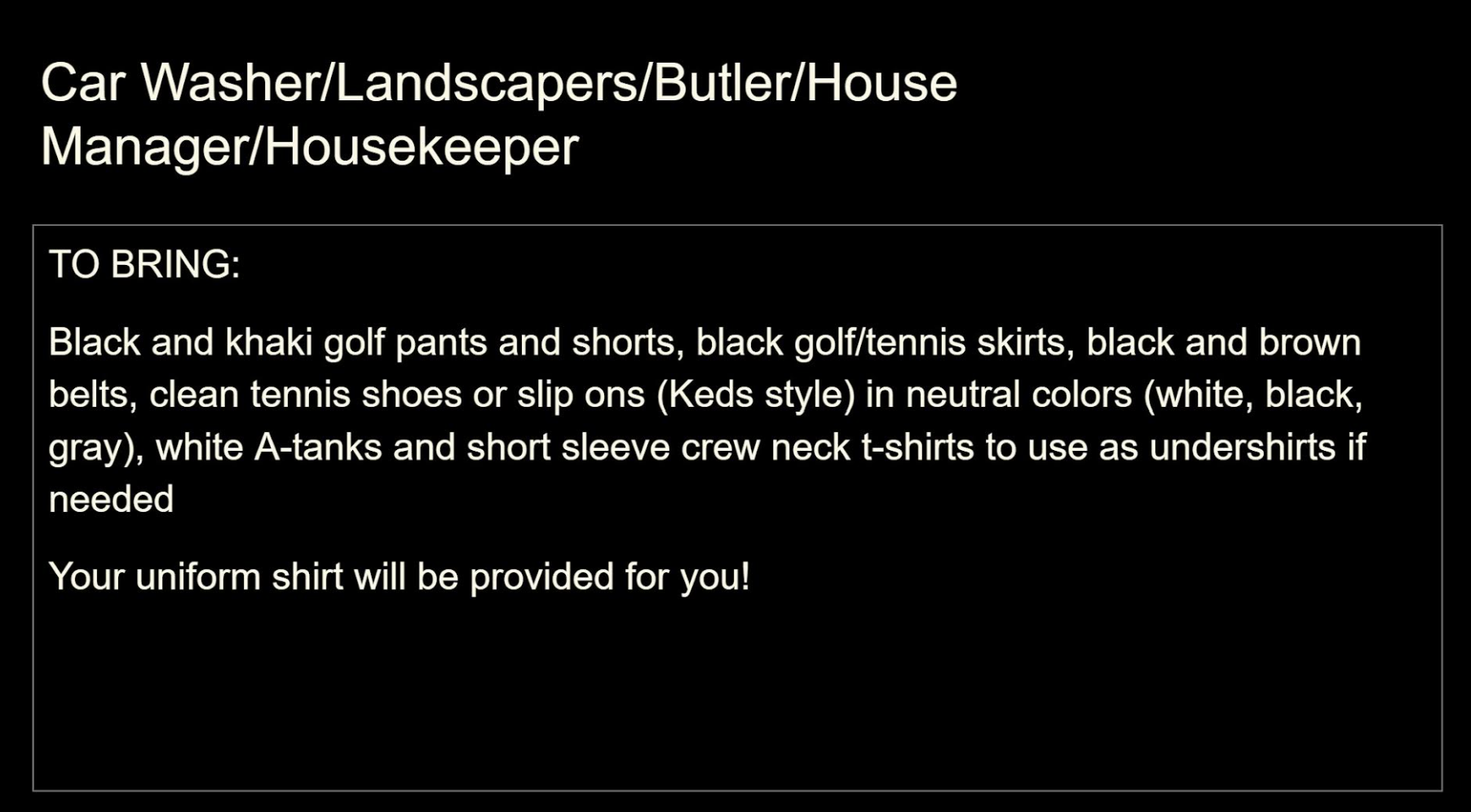 • Everyone: Arrive looking clean, rested, and well-presented