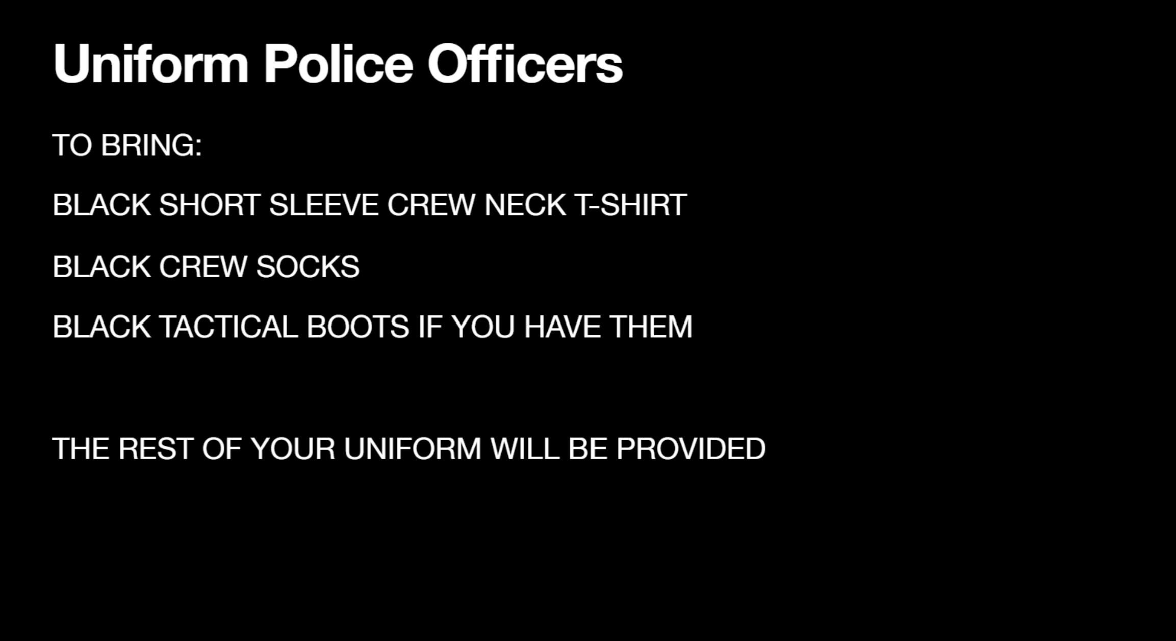 BELOW PLEASE SEE DETAILS OF WHAT TO BRING ORGANIZED BY ROLE